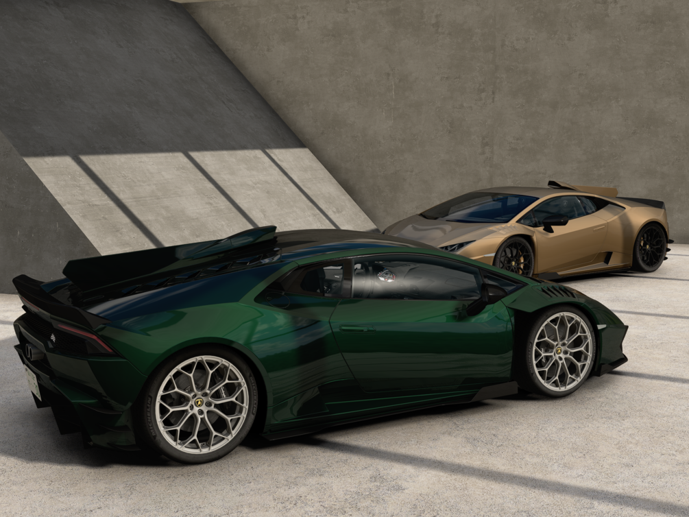 RWD Huracan Performante with custom bodykit based on various racing Huracans but with a smaller wing. Think of it as a ST Touring. Interior has been adjusted to give a slightly less sporty and a bit more of a luxurious feel.
